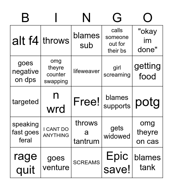 This bingo card has a free space and 24 words: I CANT DO ANYTHING, goes venture, lifeweaver, rage quit, "okay im done", alt f4, goes negative on dps, throws, blames supports, throws a tantrum, girl screaming, targeted, gets widowed, omg theyre on cas, omg theyre counter swapping, Epic save!, potg, blames sub, getting food, n wrd, blames tank, speaking fast goes feral, calls someone out for their bs and SCREAMS.