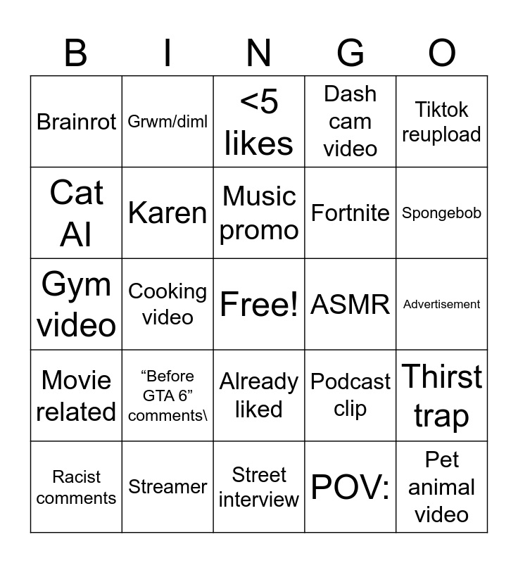 This bingo card has a free space and 24 words: “Before GTA 6” comments\, Streamer, Music promo, Racist comments, Tiktok reupload, Brainrot, Cat AI, Grwm/diml, ASMR, Already liked, Fortnite, Gym video, Podcast clip, Thirst trap, Karen, POV:, Advertisement, <5 likes, Spongebob, Cooking video, Pet animal video, Movie related, Dash cam video and Street interview.
