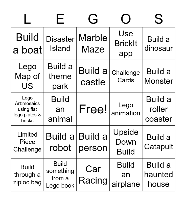 This bingo card has a free space and 27 words: Upside Down Build, Build a Pyramid, Challenge Cards, Car Racing, Lego Map of US, Marble Maze, Disaster Island, Limited Piece Challenge, Lego animation, Build a Catapult, Lego Art:mosaics using flat lego plates & bricks, Use BrickIt app, Build through a ziploc bag, Build something from a Lego book, Build a Monster, Build something with only one color, Build a theme park, Build a castle, Build a robot, Build a boat, Build a roller coaster, Build an airplane, Build an animal, Build a haunted house, Build a person, Build a dinosaur and Build a clown.