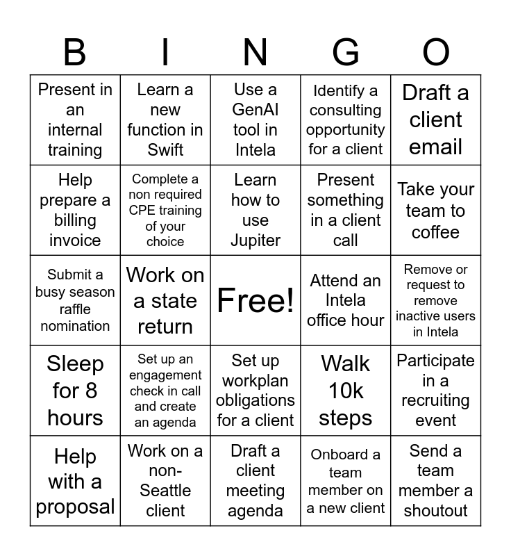 This bingo card has a free space and 24 words: Set up an engagement check in call and create an agenda, Work on a non-Seattle client, Learn how to use Jupiter, Help with a proposal, Draft a client email, Present in an internal training, Help prepare a billing invoice, Learn a new function in Swift, Attend an Intela office hour, Set up workplan obligations for a client, Present something in a client call, Submit a busy season raffle nomination, Walk 10k steps, Participate in a recruiting event, Complete a non required CPE training of your choice, Onboard a team member on a new client, Remove or request to remove inactive users in Intela, Use a GenAI tool in Intela, Take your team to coffee, Work on a state return, Send a team member a shoutout, Sleep for 8 hours, Identify a consulting opportunity for a client and Draft a client meeting agenda.