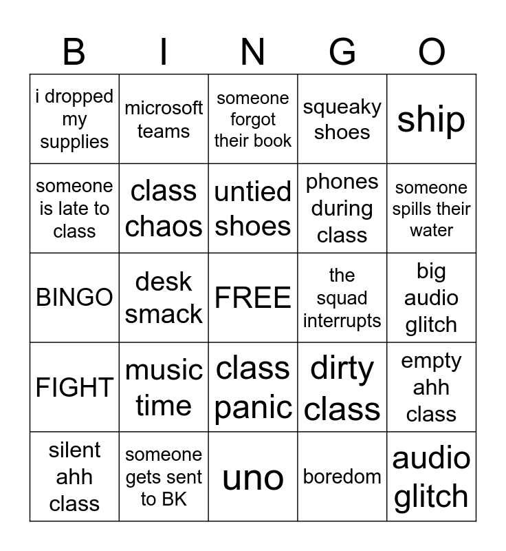 This bingo card has a free space and 39 words: easy subject, hard subject, english word in a non-english subject, class chaos, silent ahh class, class panic, untied shoes, brainrot, ship, FIGHT, desk smack, squeaky shoes, audio glitch, big audio glitch, the squad interrupts, music time, good food, i dropped my supplies, confusion, dirty class, someone is late to class, uno, phones during class, someone spills their water, switch seats, moving during indonesia raya, custom announcement, smadav jumpscare, youtube video, microsoft teams, team assignment, we go outside, someone forgot their book, someone gets sent to BK, boredom, mad teacher, empty ahh class, BINGO and closet smack.