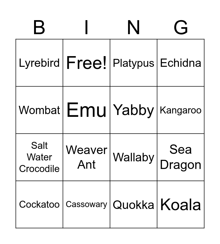 This bingo card has 16 words: Cassowary, Sea Dragon, Platypus, Lyrebird, Salt Water Crocodile, Free!, Wallaby, Quokka, Wombat, Emu, Cockatoo, Echidna, Weaver Ant, Kangaroo, Yabby and Koala.