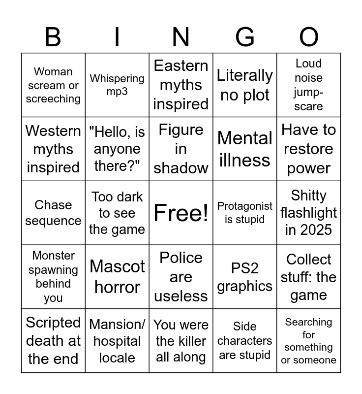 This bingo card has a free space and 24 words: Mascot horror, Mansion/ hospital locale, Figure in shadow, Scripted death at the end, Loud noise jump-scare, Woman scream or screeching, Western myths inspired, Whispering mp3, Protagonist is stupid, Police are useless, Mental illness, Chase sequence, PS2 graphics, Collect stuff: the game, "Hello, is anyone there?", Side characters are stupid, Shitty flashlight in 2025, Eastern myths inspired, Have to restore power, Too dark to see the game, Searching for something or someone, Monster spawning behind you, Literally no plot and You were the killer all along.