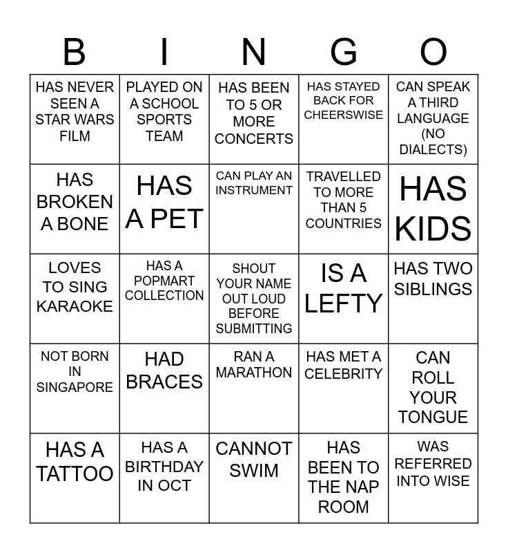 This bingo card has a free space and 24 words: HAD BRACES, HAS A BIRTHDAY IN OCT, CAN PLAY AN INSTRUMENT, HAS A TATTOO, CAN SPEAK A THIRD LANGUAGE (NO DIALECTS), HAS NEVER SEEN A STAR WARS FILM, HAS BROKEN A BONE, PLAYED ON A SCHOOL SPORTS TEAM, IS A LEFTY, RAN A MARATHON, TRAVELLED TO MORE THAN 5 COUNTRIES, LOVES TO SING KARAOKE, HAS MET A CELEBRITY, CAN ROLL YOUR TONGUE, HAS A PET, HAS BEEN TO THE NAP ROOM, HAS TWO SIBLINGS, HAS BEEN TO 5 OR MORE CONCERTS, HAS KIDS, HAS A POPMART COLLECTION, WAS REFERRED INTO WISE, NOT BORN IN SINGAPORE, HAS STAYED BACK FOR CHEERSWISE and CANNOT SWIM.