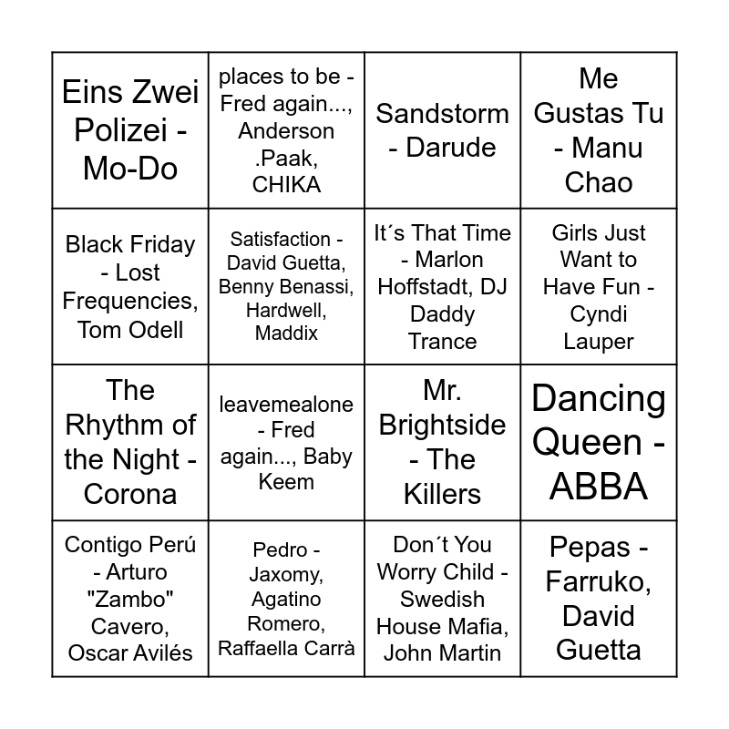 This bingo card has 27 words: Vamos a la playa - Loona, Unwritten - Natasha Bedingfield, The Rhythm of the Night - Corona, Sladké Mámení - Helena Vondráčková, Satisfaction - David Guetta, Benny Benassi, Hardwell, Maddix, Sandstorm - Darude, places to be - Fred again..., Anderson .Paak, CHIKA, Pepas - Farruko, David Guetta, Pedro - Jaxomy, Agatino Romero, Raffaella Carrà, Murder On The Dancefloor - Sophie Ellis-Bextor, Mr. Brightside - The Killers, Me Gustas Tu - Manu Chao, Low - Flo Rida, T-Pain, Levels - Avicii, leavemealone - Fred again..., Baby Keem, Kids - MGMT, It´s That Time - Marlon Hoffstadt, DJ Daddy Trance, Girls Just Want to Have Fun - Cyndi Lauper, Eyerytime We Touch - Cascada, Eins Zwei Polizei - Mo-Do, Don´t You Worry Child - Swedish House Mafia, John Martin, Don´t Cha - The Pussycat Dolls, Busta Rhymes, Dancing Queen - ABBA, Contigo Perú - Arturo "Zambo" Cavero, Oscar Avilés, Come On Eileen - Dexys Midnight Runners, Black Friday - Lost Frequencies, Tom Odell and Bla Bla Bla - Gigi D'Agostino.