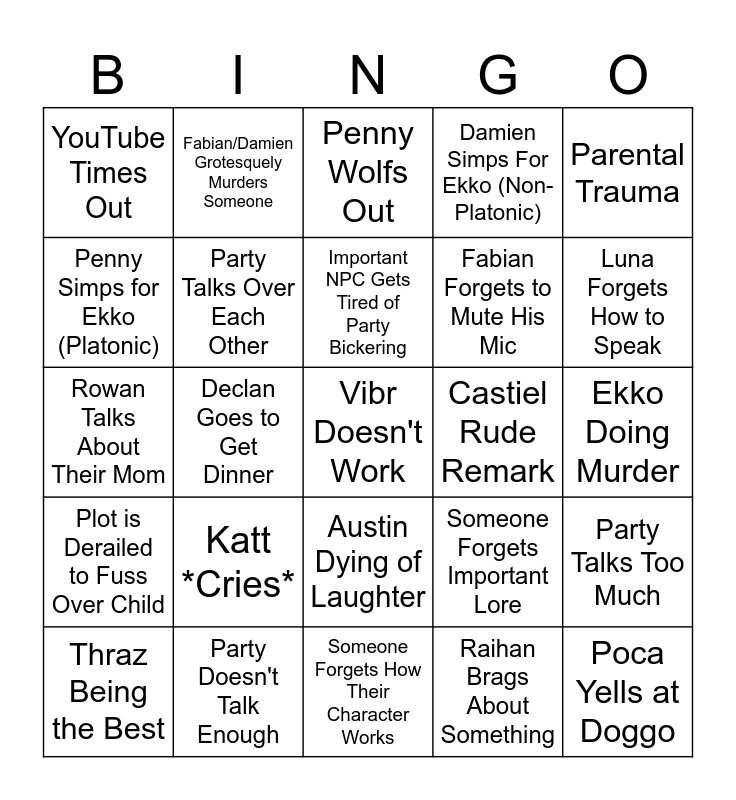 This bingo card has a free space and 24 words: Katt *Cries*, Party Doesn't Talk Enough, Important NPC Gets Tired of Party Bickering, Thraz Being the Best, Parental Trauma, YouTube Times Out, Penny Simps for Ekko (Platonic), Fabian/Damien Grotesquely Murders Someone, Castiel Rude Remark, Austin Dying of Laughter, Fabian Forgets to Mute His Mic, Rowan Talks About Their Mom, Someone Forgets Important Lore, Party Talks Too Much, Party Talks Over Each Other, Raihan Brags About Something, Ekko Doing Murder, Penny Wolfs Out, Luna Forgets How to Speak, Declan Goes to Get Dinner, Poca Yells at Doggo, Plot is Derailed to Fuss Over Child, Damien Simps For Ekko (Non-Platonic) and Someone Forgets How Their Character Works.
