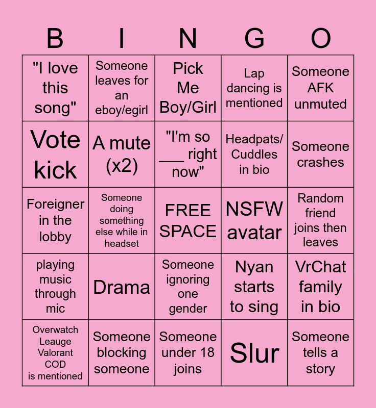 This bingo card has a free space and 28 words: VrChat family in bio, Streamer, Headpats/ Cuddles in bio, Slur, Vote kick, Pick Me Boy/Girl, Someone leaves for an eboy/egirl, playing music through mic, NSFW avatar, Overwatch Leauge Valorant COD is mentioned, Foreigner in the lobby, Lap dancing is mentioned, Someone blocking someone, Someone under 18 joins, Someone crashes, Mirror cuddling, Drama, A mute (x2), "I'm so ___ right now", Someone ignoring one gender, "I love this song", Mental disorder listed in bio, Someone tells a story, Someone doing something else while in headset, Random friend joins then leaves, Nyan starts to sing, Someone AFK unmuted and Public ERP.
