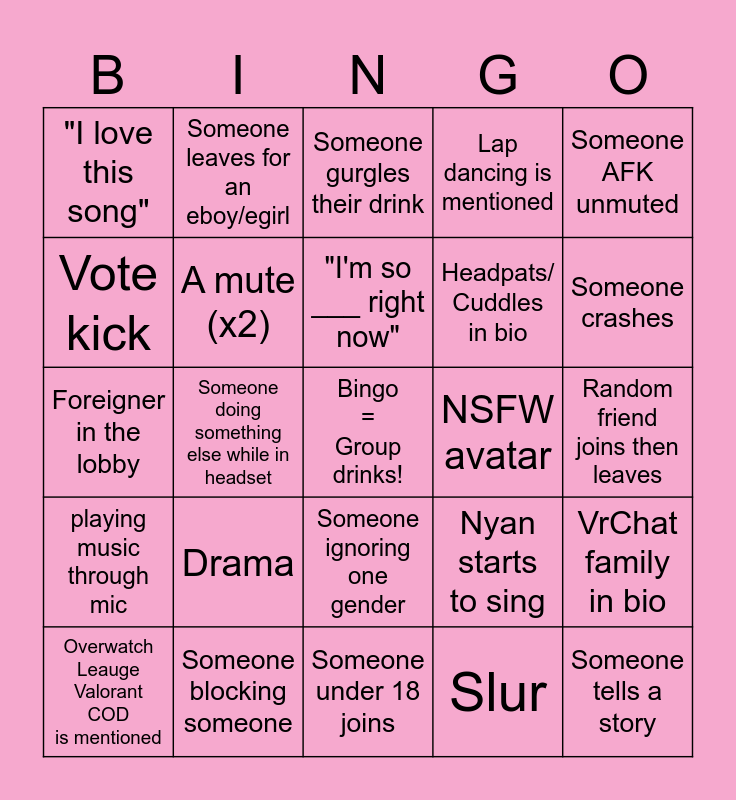 This bingo card has a free space and 28 words: VrChat family in bio, Snoring on mic (x2), Headpats/ Cuddles in bio, Slur, Vote kick, Someone gurgles their drink, Someone leaves for an eboy/egirl, playing music through mic, NSFW avatar, Overwatch Leauge Valorant COD is mentioned, Foreigner in the lobby, Lap dancing is mentioned, Someone blocking someone, Someone under 18 joins, Someone crashes, Mirror cuddling, Drama, A mute (x2), "I'm so ___ right now", Someone ignoring one gender, "I love this song", Mental disorder listed in bio, Someone tells a story, Someone doing something else while in headset, Random friend joins then leaves, Nyan starts to sing, Someone AFK unmuted and Public ERP.