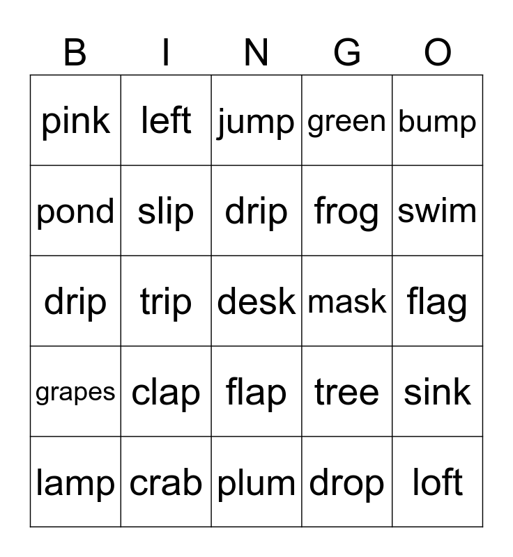 This bingo card has a free space and 24 words: clap, crab, drip, lamp, bump, pink, pond, left, mask, flap, frog, drip, tree, sink, slip, drop, flag, jump, swim, trip, loft, grapes, green and plum.