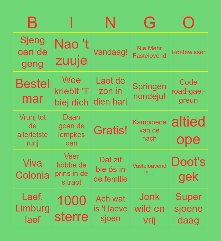 This bingo card has a free space and 24 words: Veer höbbe de prins in de sjtraot, 1000 sterre, Laot de zon in dien hart, Laef, Limburg laef, Roetewisser, Sjeng oan de geng, Bestel mar, Nao 't zuuje, Kampioene van de nach, Dat zit bie ós in de femilie, Springen nondeju!, Vrunj tot de allerletste runj, Vasteloavend is...., Doot's gek, Woe krieblt 'T biej dich, Jonk wild en vrij, altied ope, Vandaag!, Code road-gael-greun, Daan goan de lempkes oan, Super sjoene daag, Viva Colonia, Nie Mehr Fastelovend and Ach wat is 't laeve sjoen.