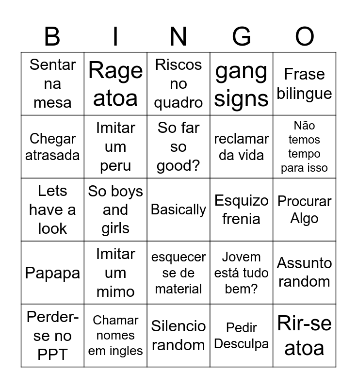 This bingo card has a free space and 24 words: Perder-se no PPT, Imitar um mimo, So far so good?, Pedir Desculpa, Frase bilingue, Sentar na mesa, Rage atoa, Riscos no quadro, Esquizo frenia, Procurar Algo, Lets have a look, Imitar um peru, Jovem está tudo bem?, Assunto random, Chegar atrasada, Chamar nomes em ingles, Silencio random, gang signs, Não temos tempo para isso, Papapa, So boys and girls, esquecer se de material, reclamar da vida and Rir-se atoa.