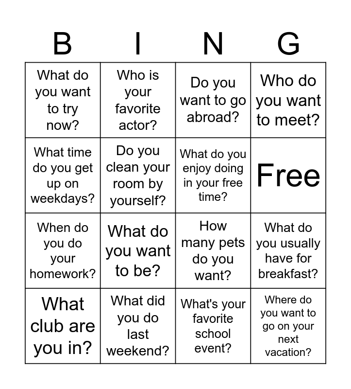 This bingo card has 18 words: What do you want to be?, Where do you want to go on your next vacation?, Do you want to go abroad?, What do you want to try now?, How many pets do you want?, Who do you want to meet?, What club are you in?, Who is your favorite actor?, Free, When do you do your homework?, What's your favorite school event?, What time do you get up on weekdays?, What do you usually have for breakfast?, Do you clean your room by yourself?, What do you enjoy doing in your free time?, Do you often go out on Sundays?, What did you do last weekend? and Where did you go during the winter vacation?.