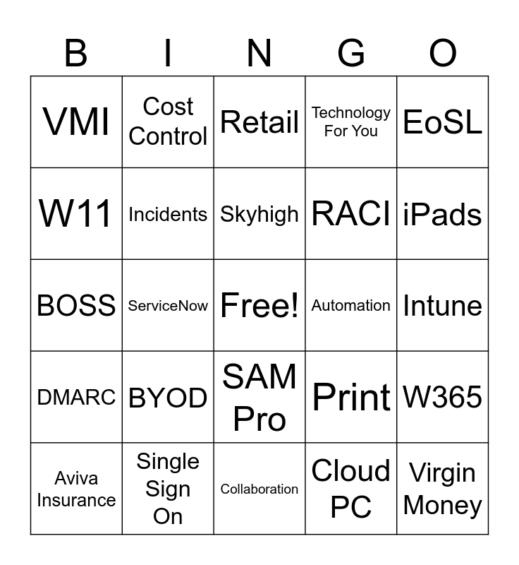 This bingo card has a free space and 24 words: BYOD, Single Sign On, Skyhigh, Aviva Insurance, EoSL, VMI, W11, Cost Control, Automation, SAM Pro, RACI, BOSS, Print, W365, Incidents, Cloud PC, Intune, Retail, iPads, ServiceNow, Virgin Money, DMARC, Technology For You and Collaboration.