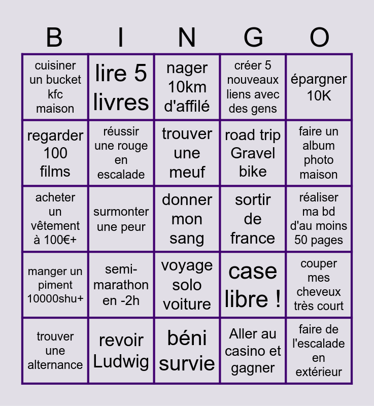 This bingo card has 25 words: semi-marathon en -2h, béni survie, trouver une meuf, trouver une alternance, épargner 10K, cuisiner un bucket kfc maison, regarder 100 films, lire 5 livres, sortir de france, voyage solo voiture, road trip Gravel bike, acheter un vêtement à 100€+, case libre !, couper mes cheveux très court, réussir une rouge en escalade, faire de l'escalade en extérieur, réaliser ma bd d'au moins 50 pages, nager 10km d'affilé, faire un album photo maison, surmonter une peur, donner mon sang, revoir Ludwig, manger un piment 10000shu+, créer 5 nouveaux liens avec des gens and Aller au casino et gagner.