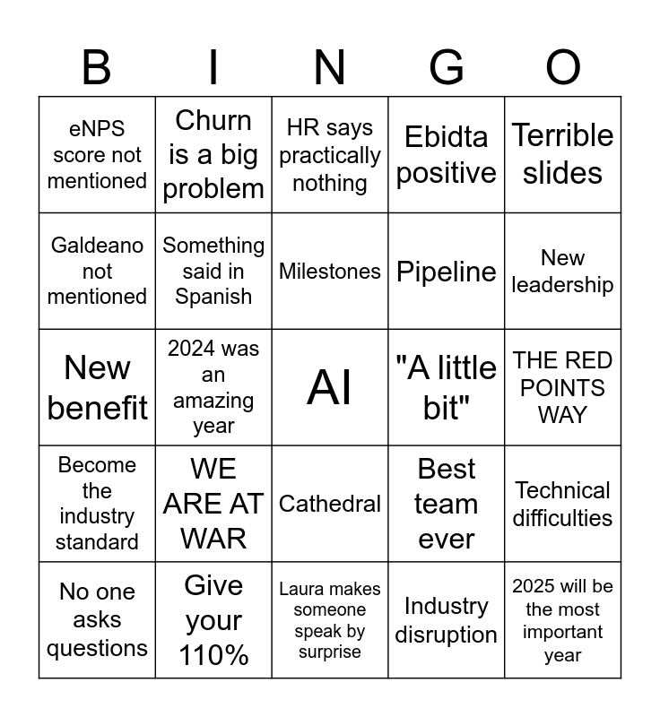 This bingo card has a free space and 24 words: WE ARE AT WAR, Give your 110%, Milestones, No one asks questions, Terrible slides, eNPS score not mentioned, Galdeano not mentioned, Churn is a big problem, "A little bit", Cathedral, Pipeline, New benefit, Best team ever, Technical difficulties, Something said in Spanish, Industry disruption, THE RED POINTS WAY, HR says practically nothing, New leadership, 2024 was an amazing year, 2025 will be the most important year, Become the industry standard, Ebidta positive and Laura makes someone speak by surprise.