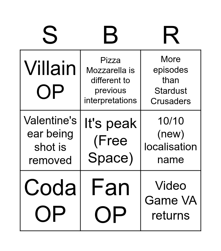 This bingo card has a free space and 8 words: 10/10 (new) localisation name, More episodes than Stardust Crusaders, Pizza Mozzarella is different to previous interpretations, Coda OP, Villain OP, Video Game VA returns, Valentine's ear being shot is removed and Fan OP.