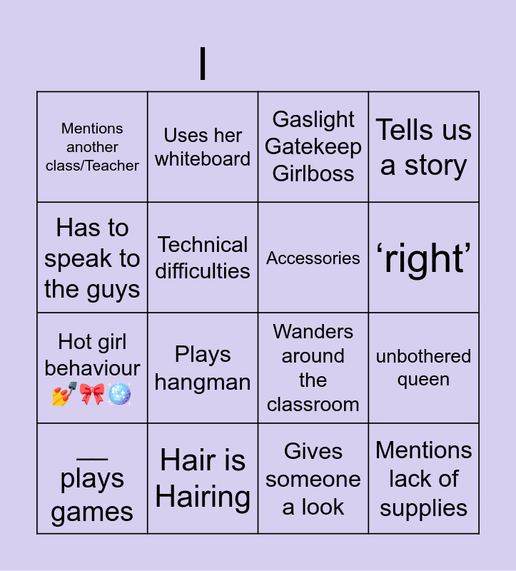 This bingo card has 16 words: Hair is Hairing, unbothered queen, Gaslight Gatekeep Girlboss, Mentions another class/Teacher, Hot girl behaviour π ππͺ©, Uses her whiteboard, Wanders around the classroom, Gives someone a look, Has to speak to the guys, Technical difficulties, __ plays games, Tells us a story, Plays hangman, βrightβ, Accessories and Mentions lack of supplies.