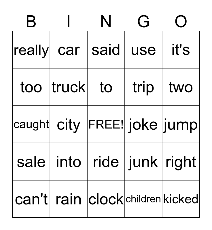 This bingo card has a free space and 24 words: into, rain, to, can't, it's, really, too, car, joke, ride, trip, caught, junk, right, truck, children, jump, said, two, city, kicked, sale, use and clock.