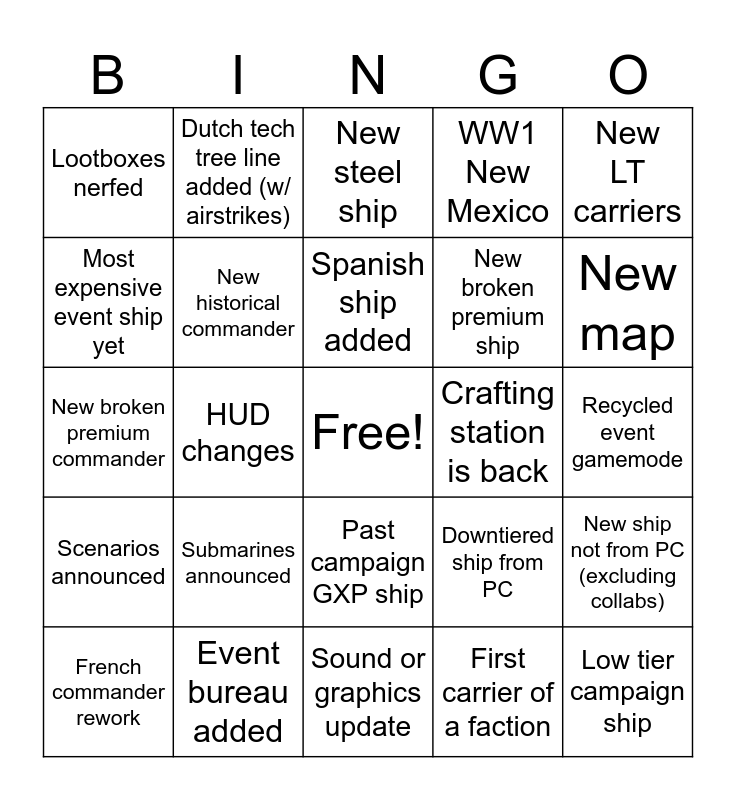 This bingo card has a free space and 24 words: Submarines announced, Event bureau added, Spanish ship added, French commander rework, New LT carriers, Lootboxes nerfed, Most expensive event ship yet, Dutch tech tree line added (w/ airstrikes), Crafting station is back, Past campaign GXP ship, New broken premium ship, New broken premium commander, Downtiered ship from PC, New ship not from PC (excluding collabs), New historical commander, First carrier of a faction, Recycled event gamemode, New steel ship, New map, HUD changes, Low tier campaign ship, Scenarios announced, WW1 New Mexico and Sound or graphics update.
