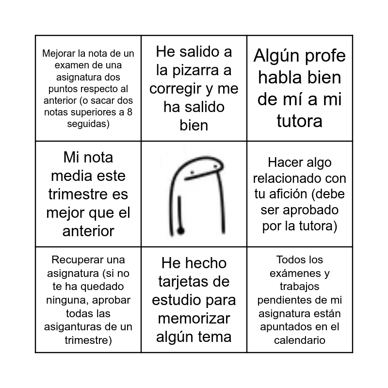 This bingo card has a free space and 15 words: Tengo todos mis exámenes apuntados en la agenda a final del mes, He hecho un esquema o un resumen del tema de alguna asignatura difícil, Algún profe habla bien de mí a mi tutora, Mejorar la nota de un examen de una asignatura dos puntos respecto al anterior (o sacar dos notas superiores a 8 seguidas), He hecho tarjetas de estudio para memorizar algún tema, Todos los exámenes y trabajos pendientes de mi asignatura están apuntados en el calendario, Leer dos libros diferentes (tengo que avisar que me lo empiezo a leer y explicar el libro a la profe cuando termine), He aprobado más asignaturas que en el trimestre anterior (o las mismas si no suspendiste nada), Hacer algo relacionado con tu afición (debe ser aprobado por la tutora), He hecho feliz/reír a algún profe, No me han puesto ninguna amonestación en todo el mes, Mi nota media este trimestre es mejor que el anterior, Recuperar una asignatura (si no te ha quedado ninguna, aprobar todas las asiganturas de un trimestre), He salido a la pizarra a corregir y me ha salido bien and He traído todos los materiales que piden durante todo un mes.