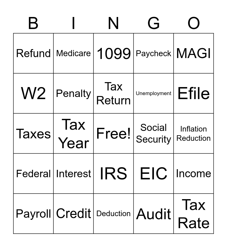 This bingo card has a free space and 28 words: Income, Withholding, Unemployment, Audit, W2, 1099, Medicare, Federal, Social Security, Payroll, Taxes, Paycheck, Credit, Deduction, Efile, Exemption, Interest, Penalty, Tax Return, IRS, Refund, Tax Liability, Tax Rate, Tax Year, Inflation Reduction, EIC, MAGI and AGI.