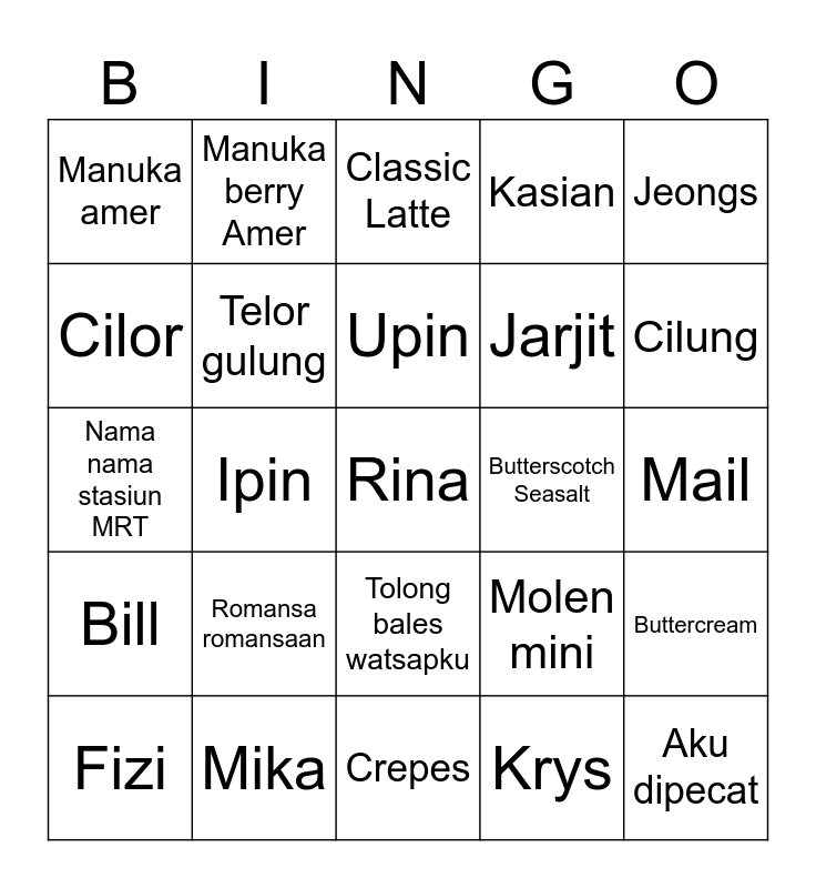 This bingo card has 25 words: Bill, Mika, Rina, Krys, Jeongs, Manuka amer, Manuka berry Amer, Classic Latte, Butterscotch Seasalt, Buttercream, Cilor, Telor gulung, Crepes, Molen mini, Cilung, Fizi, Ipin, Upin, Jarjit, Mail, Nama nama stasiun MRT, Romansa romansaan, Tolong bales watsapku, Kasian and Aku dipecat.