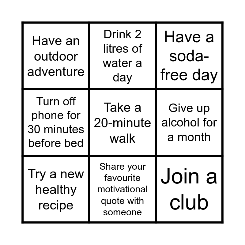This bingo card has 56 words: Read a book for 20 minutes a day, Hit your personal savings goal, Take an international trip (outside of Europe), Have an outdoor adventure, Try a new social hobby, Learn a new skill, Try a new healthy recipe, Give up alcohol for a month, Join a club, See a live art performance, Turn off phone for 30 minutes before bed, Drink 2 Liters of water a day, 5 minutes mediation morning or evening, Find a new exercise routine, Get off social media for a week, Visit the museum, Take a 20-minute walk, Avoid fast food for a week, Compliment a coworker, Stretch for 10 minutes, List 5 things you are thankful for, Participate in an online yoga class, Get 8 hours of sleep, Have a soda-free day, Eat 3 or more servings of fruit, Share your favourite motivational quote with someone, Write in a journal for a week, Donate to a charity or cause you care about, Read a book for 20 minutes a day, Save more money, Take an international trip, Take up gardening, Try a new hobby, Learn a new skill, Improve your cooking abilities, Give up alcohol for a month, Join a club, See a live art performance, Turn off your phone for 30 minutes before bed, Drink 2 litres of water a day, Write more, Volunteer at a charity, 5 minutes mediation in the morning or evening, Find a new exercise routine, Get off social media for a week, Visit a museum, Take a 20-minute walk every day, Avoid fast food for a week, Have less takeaways, Stretch for 10 minutes every day, List things you are thankful for every day, Take up yoga , Get 8 hours of sleep , Stop drinking fizzy drinks, Eat your 5 a day and Run a half marathon.