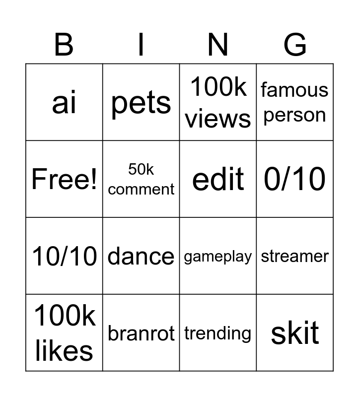 This bingo card has 16 words: branrot, streamer, 100k views, ai, 10/10, pets, gameplay, trending, Free!, 50k comment, 100k likes, famous person, dance, 0/10, edit and skit.