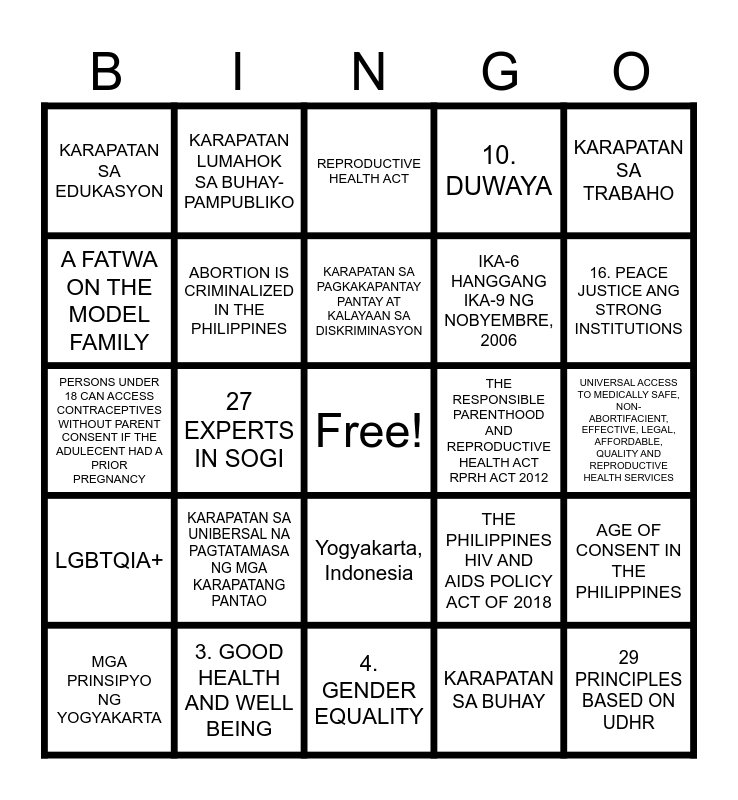 This bingo card has a free space and 24 words: MGA PRINSIPYO NG YOGYAKARTA, KARAPATAN SA UNIBERSAL NA PAGTATAMASA NG MGA KARAPATANG PANTAO, KARAPATAN SA PAGKAKAPANTAY PANTAY AT KALAYAAN SA DISKRIMINASYON, KARAPATAN SA BUHAY, KARAPATAN SA TRABAHO, KARAPATAN SA EDUKASYON, KARAPATAN LUMAHOK SA BUHAY-PAMPUBLIKO, REPRODUCTIVE HEALTH ACT, THE RESPONSIBLE PARENTHOOD AND REPRODUCTIVE HEALTH ACT RPRH ACT 2012, UNIVERSAL ACCESS TO MEDICALLY SAFE, NON-ABORTIFACIENT, EFFECTIVE, LEGAL, AFFORDABLE, QUALITY AND REPRODUCTIVE HEALTH SERVICES, PERSONS UNDER 18 CAN ACCESS CONTRACEPTIVES WITHOUT PARENT CONSENT IF THE ADULECENT HAD A PRIOR PREGNANCY, ABORTION IS CRIMINALIZED IN THE PHILIPPINES, THE PHILIPPINES HIV AND AIDS POLICY ACT OF 2018, AGE OF CONSENT IN THE PHILIPPINES, A FATWA ON THE MODEL FAMILY, 3. GOOD HEALTH AND WELL BEING, 4. GENDER EQUALITY, 10. DUWAYA, 16. PEACE JUSTICE ANG STRONG INSTITUTIONS, LGBTQIA+, 27 EXPERTS IN SOGI, Yogyakarta, Indonesia, IKA-6 HANGGANG IKA-9 NG NOBYEMBRE, 2006 and 29 PRINCIPLES BASED ON UDHR.