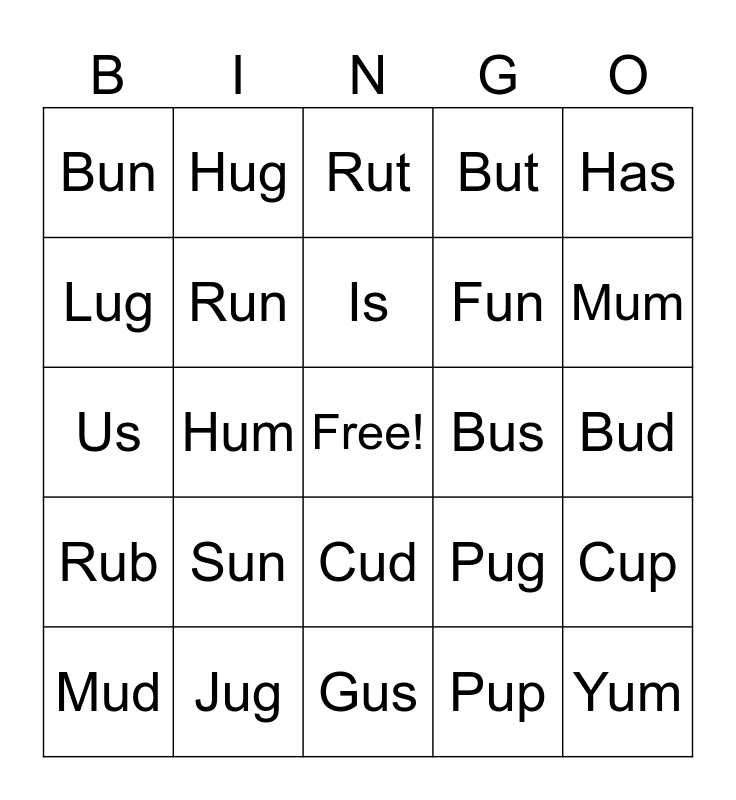 This bingo card has a free space and 24 words: Sun, Jug, Is, Mud, Has, Bun, Lug, Hug, Bus, Cud, Fun, Us, Pug, Cup, Run, Pup, Bud, Rut, Mum, Hum, Yum, Rub, But and Gus.