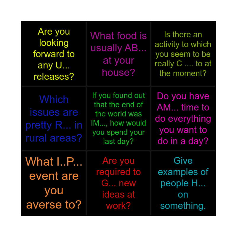 This bingo card has 9 words: What I..P... event are you averse to?, Is there an activity to which you seem to be really C .... to at the moment?, What food is usually AB... at your house?, Which issues are pretty R... in rural areas?, Are you looking forward to any U... releases?, Do you have AM... time to do everything you want to do in a day?, If you found out that the end of the world was IM..., how would you spend your last day?, Give examples of people H... on something. and Are you required to G... new ideas at work?.