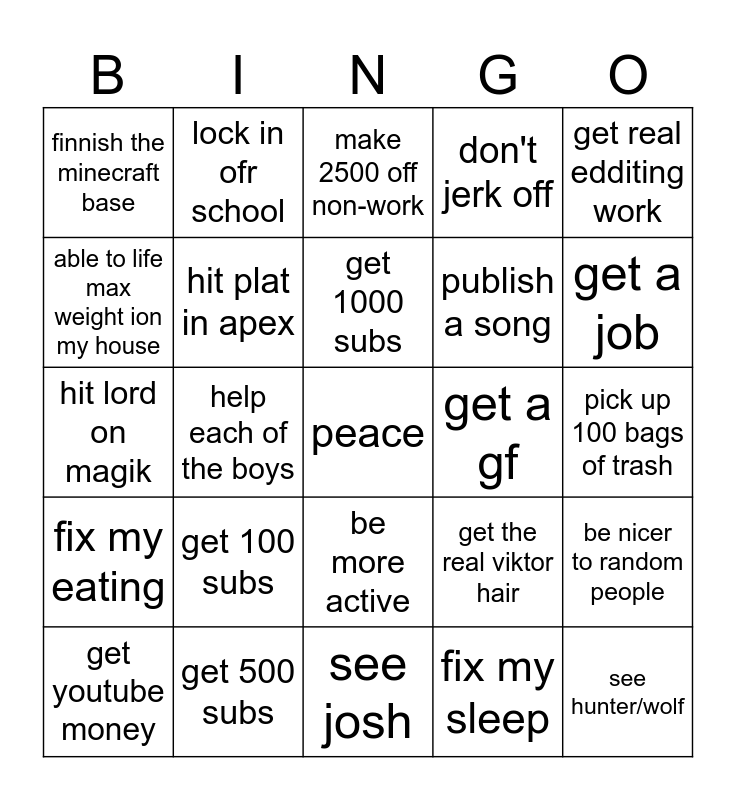 This bingo card has a free space and 24 words: get 100 subs, get 500 subs, get 1000 subs, get youtube money, get real edditing work, finnish the minecraft base, able to life max weight ion my house, lock in ofr school, get a gf, be more active, publish a song, hit lord on magik, get the real viktor hair, be nicer to random people, hit plat in apex, fix my sleep, pick up 100 bags of trash, make 2500 off non-work, get a job, help each of the boys, see hunter/wolf, fix my eating, don't jerk off and see josh.