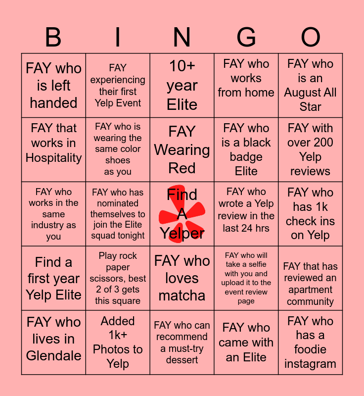 This bingo card has a free space and 24 words: Play rock paper scissors, best 2 of 3 gets this square, Added 1k+ Photos to Yelp, FAY Wearing Red, FAY who lives in Glendale, FAY who is an August All Star, FAY who is left handed, FAY that works in Hospitality, FAY experiencing their first Yelp Event, FAY who wrote a Yelp review in the last 24 hrs, FAY who loves matcha, FAY who is a black badge Elite, FAY who works in the same industry as you, FAY who will take a selfie with you and upload it to the event review page, FAY that has reviewed an apartment community, FAY who is wearing the same color shoes as you, FAY who came with an Elite, FAY who has 1k check ins on Yelp, 10+ year Elite, FAY with over 200 Yelp reviews, FAY who has nominated themselves to join the Elite squad tonight, FAY who has a foodie instagram, Find a first year Yelp Elite, FAY who works from home and FAY who can recommend a must-try dessert.