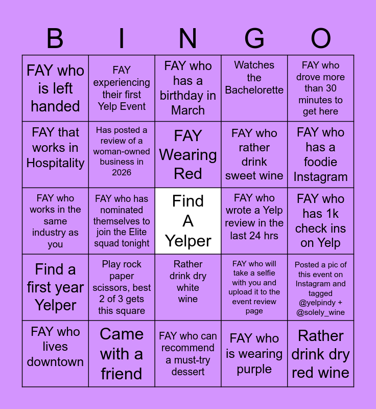 This bingo card has a free space and 24 words: Play rock paper scissors, best 2 of 3 gets this square, Came with a friend, FAY Wearing Red, FAY who lives downtown, FAY who drove more than 30 minutes to get here, FAY who is left handed, FAY that works in Hospitality, FAY experiencing their first Yelp Event, FAY who wrote a Yelp review in the last 24 hrs, Rather drink dry white wine, FAY who rather drink sweet wine, FAY who works in the same industry as you, FAY who will take a selfie with you and upload it to the event review page, Posted a pic of this event on Instagram and tagged @yelpindy + @solely_wine, Has posted a review of a woman-owned business in 2026, FAY who is wearing purple, FAY who has 1k check ins on Yelp, FAY who has a birthday in March, FAY who has a foodie Instagram, FAY who has nominated themselves to join the Elite squad tonight, Rather drink dry red wine, Find a first year Yelper, Watches the Bachelorette and FAY who can recommend a must-try dessert.