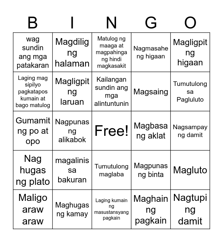 This bingo card has a free space and 24 words: magalinis sa bakuran, Maghugas ng kamay, Kailangan sundin ang mga alintuntunin, Maligo araw araw, Magligpit ng higaan, wag sundin ang mga patakaran, Laging mag sipilyo pagkatapos kumain at bago matulog, Magdilig ng halaman, Magbasa ng aklat, Tumutulong maglaba, Magsaing, Gumamit ng po at opo, Magpunas ng binta, Magluto, Magligpit ng laruan, Maghain ng pagkain, Nagsampay ng damit, Matulog ng maaga at magpahinga ng hindi magkasakit, Tumutulong sa Pagluluto, Nagpunas ng alikabok, Nagtupi ng damit, Nag hugas ng plato, Nagmasahe ng higaan and Laging kumain ng masustansyang pagkain.