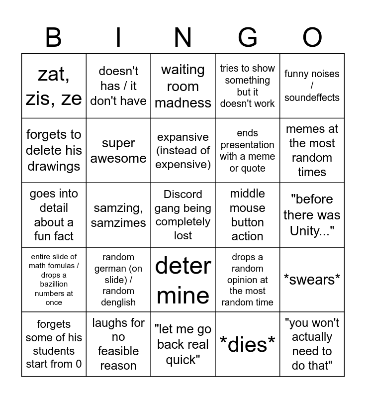 This bingo card has a free space and 30 words: laughs for no feasible reason, lopai explaining something in 2 sentences that Stephan talked 30min about, samzing, samzimes, smuus, zat, zis, ze, waiting room madness, super awesome, deter mine, middle mouse button action, "let me go back real quick", "before there was Unity...", "you won't actually need to do that", *dies*, talks about games nobody has ever heard of, memes at the most random times, wants to convince us that the universe / our world is a computer game, drops a random opinion at the most random time, entire slide of math fomulas / drops a bazillion numbers at once, random german (on slide) / random denglish, funny noises / soundeffects, goes into detail about a fun fact, says something that makes him sound ancient, doesn't has / it don't have, ends presentation with a meme or quote, forgets to delete his drawings, tries to show something but it doesn't work, *swears*, forgets some of his students start from 0, expansive (instead of expensive) and helth.