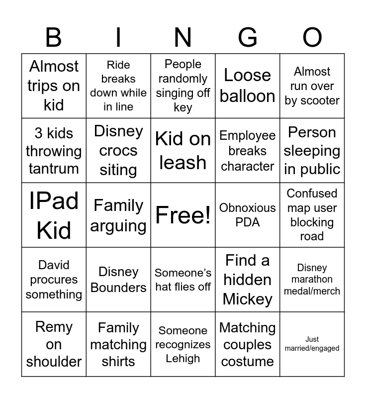 This bingo card has a free space and 24 words: Disney Bounders, Family matching shirts, Kid on leash, Remy on shoulder, Almost run over by scooter, Almost trips on kid, 3 kids throwing tantrum, Ride breaks down while in line, Obnoxious PDA, Someone’s hat flies off, Employee breaks character, IPad Kid, Find a hidden Mickey, Disney marathon medal/merch, Disney crocs siting, Matching couples costume, Confused map user blocking road, People randomly singing off key, Person sleeping in public, Family arguing, Just married/engaged, David procures something, Loose balloon and Someone recognizes Lehigh.