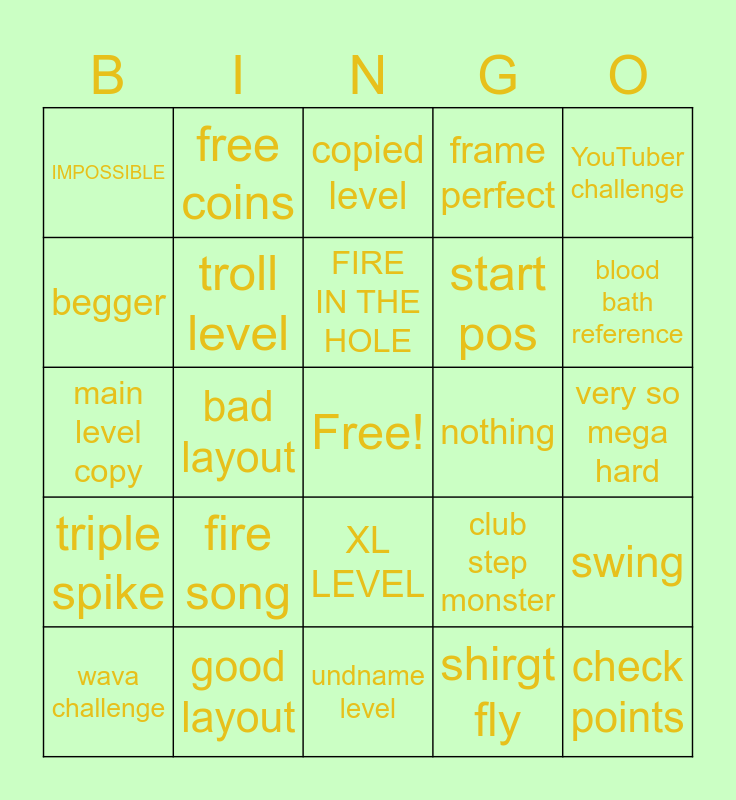 This bingo card has a free space and 24 words: fire song, good layout, FIRE IN THE HOLE, wava challenge, YouTuber challenge, IMPOSSIBLE, begger, free coins, nothing, XL LEVEL, start pos, main level copy, club step monster, swing, troll level, shirgt fly, very so mega hard, copied level, blood bath reference, bad layout, check points, triple spike, frame perfect and undname level.