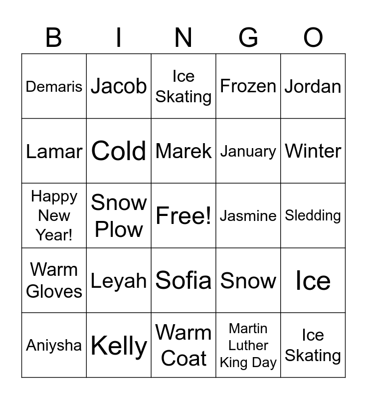 This bingo card has a free space and 24 words: Leyah, Kelly, Marek, Aniysha, Jordan, Demaris, Lamar, Jacob, Jasmine, Sofia, January, Happy New Year!, Snow, Ice, Cold, Martin Luther King Day, Sledding, Ice Skating, Winter, Snow Plow, Ice Skating, Warm Gloves, Frozen and Warm Coat.