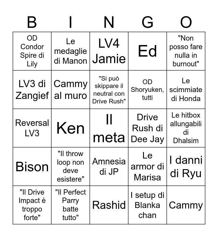 This bingo card has a free space and 24 words: "Il throw loop non deve esistere", "Il Perfect Parry batte tutto", "Si può skippare il neutral con Drive Rush", "Il Drive Impact è troppo forte", "Non posso fare nulla in burnout", OD Condor Spire di Lily, LV3 di Zangief, Le medaglie di Manon, Drive Rush di Dee Jay, Amnesia di JP, OD Shoryuken, tutti, Reversal LV3, Le armor di Marisa, I danni di Ryu, Cammy al muro, I setup di Blanka chan, Le hitbox allungabili di Dhalsim, LV4 Jamie, Le scimmiate di Honda, Ken, Cammy, Bison, Ed and Rashid.