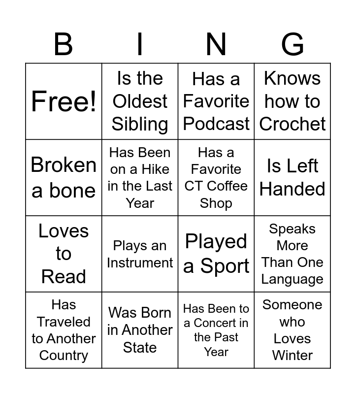 This bingo card has 16 words: Was Born in Another State, Speaks More Than One Language, Has a Favorite Podcast, Free!, Loves to Read, Is the Oldest Sibling, Played a Sport, Has Been to a Concert in the Past Year, Broken a bone, Has Been on a Hike in the Last Year, Has Traveled to Another Country, Knows how to Crochet, Plays an Instrument, Is Left Handed, Has a Favorite CT Coffee Shop and Someone who Loves Winter.