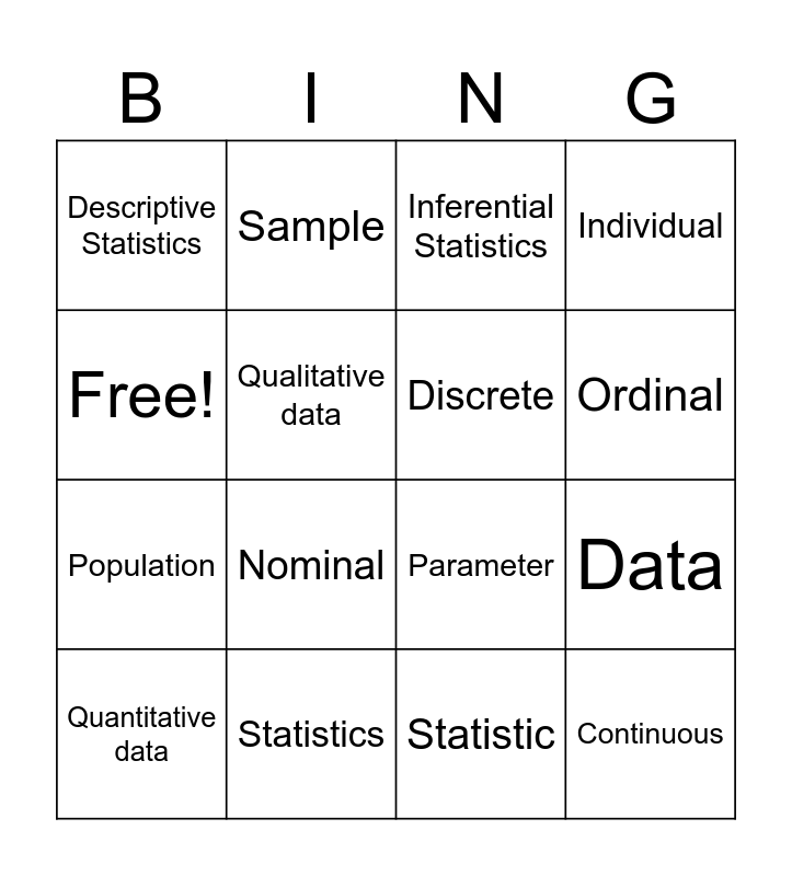 This bingo card has 16 words: Statistics, Data, Inferential Statistics, Descriptive Statistics, Population, Sample, Parameter, Statistic, Free!, Qualitative data, Quantitative data, Individual, Nominal, Ordinal, Discrete and Continuous.