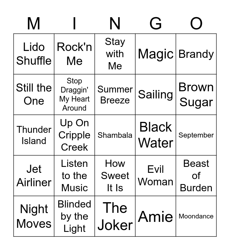 This bingo card has 35 words: Dreams, What a Fool Believes, I Love a Rainy Night, Stop Draggin' My Heart Around, How Sweet It Is, Magic, Still the One, You Are the Woman, Summer Breeze, Hello It's Me, Thunder Island, Brandy, Afternoon Delight, Cherry, Cherry, Lido Shuffle, Black Water, Amie, Up On Cripple Creek, Jet Airliner, Shambala, Evil Woman, Night Moves, Beast of Burden, Blinded by the Light, Stay with Me, Brown Sugar, Moondance, Saturday in the Park, Sailing, September, Escape (Pina Colada Song), The Joker, Listen to the Music, Rock'n Me and December 1963.
