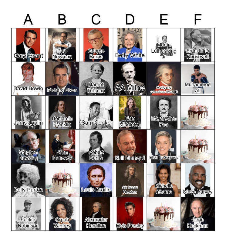This bingo card has 36 images and 32 words: Sir Isaac Newton, Louis Braille, Elvis Presley, David Bowie, Stephen Hawking, Kate Middleton, Richard Nixon, Alexander Hamilton, Martin Luther King Jr, Michelle Obama, Muhammed Ali, Betty White, Steve Harvey, Benjamin Franklin, AA Milne, Cary Grant, Dolly Parton, Edgar Allen Poe, Janis Joplin, George Burns, Sam Cooke, John Hancock, Neil Diamond, Robert Burns, Ellen DeGeneres, Paul Newman, Wolfgang Amadeus Mozart, Orpah Winfrey, Harriet Tubman, Franklin D Roosevelt, Gene Hackman and Jackie Robinson.