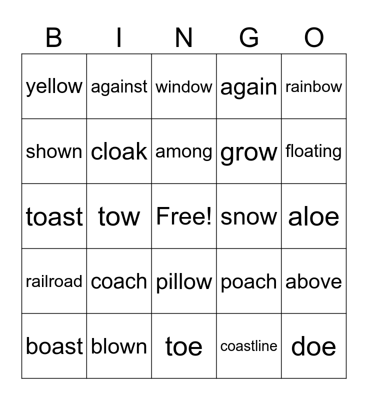 This bingo card has a free space and 29 words: boast, boat, tow, throw, yellow, window, cloak, coach, snow, blown, aloe, doe, toe, coastline, floating, oatmeal, pillow, railroad, rainbow, toast, poach, goal, grow, shown, again, against, above, among and today.