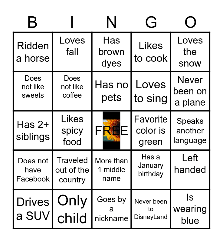 This bingo card has a free space and 24 words: Traveled out of the country, Only child, Has no pets, Drives a SUV, Loves the snow, Ridden a horse, Does not like sweets, Loves fall, Favorite color is green, More than 1 middle name, Loves to sing, Has 2+ siblings, Has a January birthday, Left handed, Does not like coffee, Never been to DisneyLand, Speaks another language, Has brown dyes, Never been on a plane, Likes spicy food, Is wearing blue, Does not have Facebook, Likes to cook and Goes by a nickname.