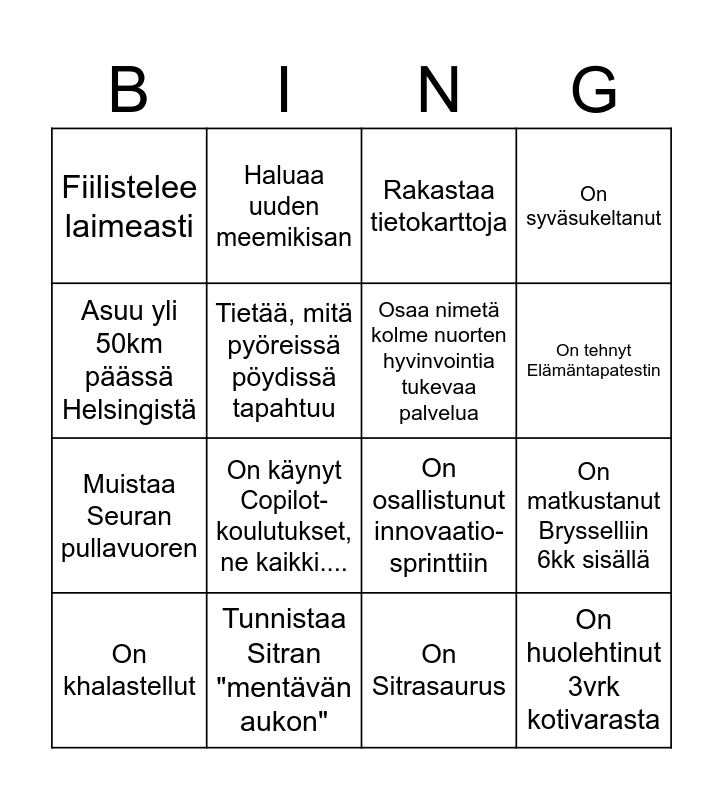 This bingo card has 16 words: Tunnistaa Sitran "mentävän aukon", On matkustanut Brysselliin 6kk sisällä, Rakastaa tietokarttoja, Fiilistelee laimeasti, Muistaa Seuran pullavuoren, Haluaa uuden meemikisan, On osallistunut innovaatio- sprinttiin, On Sitrasaurus, Asuu yli 50km päässä Helsingistä, Tietää, mitä pyöreissä pöydissä tapahtuu, On khalastellut, On syväsukeltanut, On käynyt Copilot-koulutukset, ne kaikki...., On tehnyt Elämäntapatestin, Osaa nimetä kolme nuorten hyvinvointia tukevaa palvelua and On huolehtinut 3vrk kotivarasta.