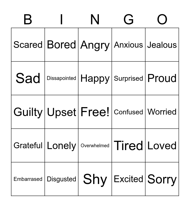 This bingo card has a free space and 26 words: Overwhelmed, Excited, Happy, Disgusted, Jealous, Scared, Sad, Bored, Worried, Tired, Surprised, Guilty, Loved, Embarrased, Upset, Hurt, Anxious, Grateful, Angry, Sorry, Proud, Shy, Confused, Lonely, Dissapointed and Shocked.