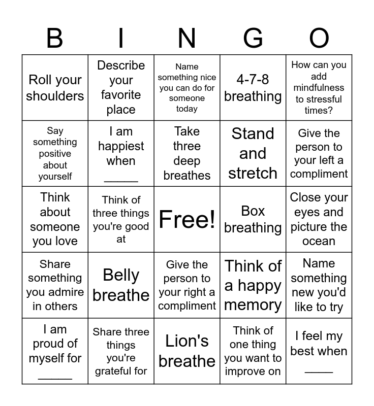 This bingo card has a free space and 24 words: Belly breathe, Share three things you're grateful for, Take three deep breathes, I am proud of myself for _____, How can you add mindfulness to stressful times?, Roll your shoulders, Say something positive about yourself, Describe your favorite place, Box breathing, Give the person to your right a compliment, Stand and stretch, Think about someone you love, Think of a happy memory, Name something new you'd like to try, I am happiest when _____, Think of one thing you want to improve on, Close your eyes and picture the ocean, Name something nice you can do for someone today, Give the person to your left a compliment, Think of three things you're good at, I feel my best when ____, Share something you admire in others, 4-7-8 breathing and Lion's breathe.
