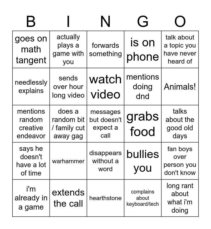 This bingo card has 25 words: warhammer, hearthstone, watch video, i'm already in a game, talk about a topic you have never heard of, goes on math tangent, needlessly explains, actually plays a game with you, grabs food, disappears without a word, mentions doing dnd, mentions random creative endeavor, bullies you, fan boys over person you don't know, sends over hour long video, long rant about what i'm doing, talks about the good old days, forwards something, Animals!, does a random bit / family cut away gag, messages but doesn't expect a call, extends the call, says he doesn't have a lot of time, is on phone and complains about keyboard/tech.
